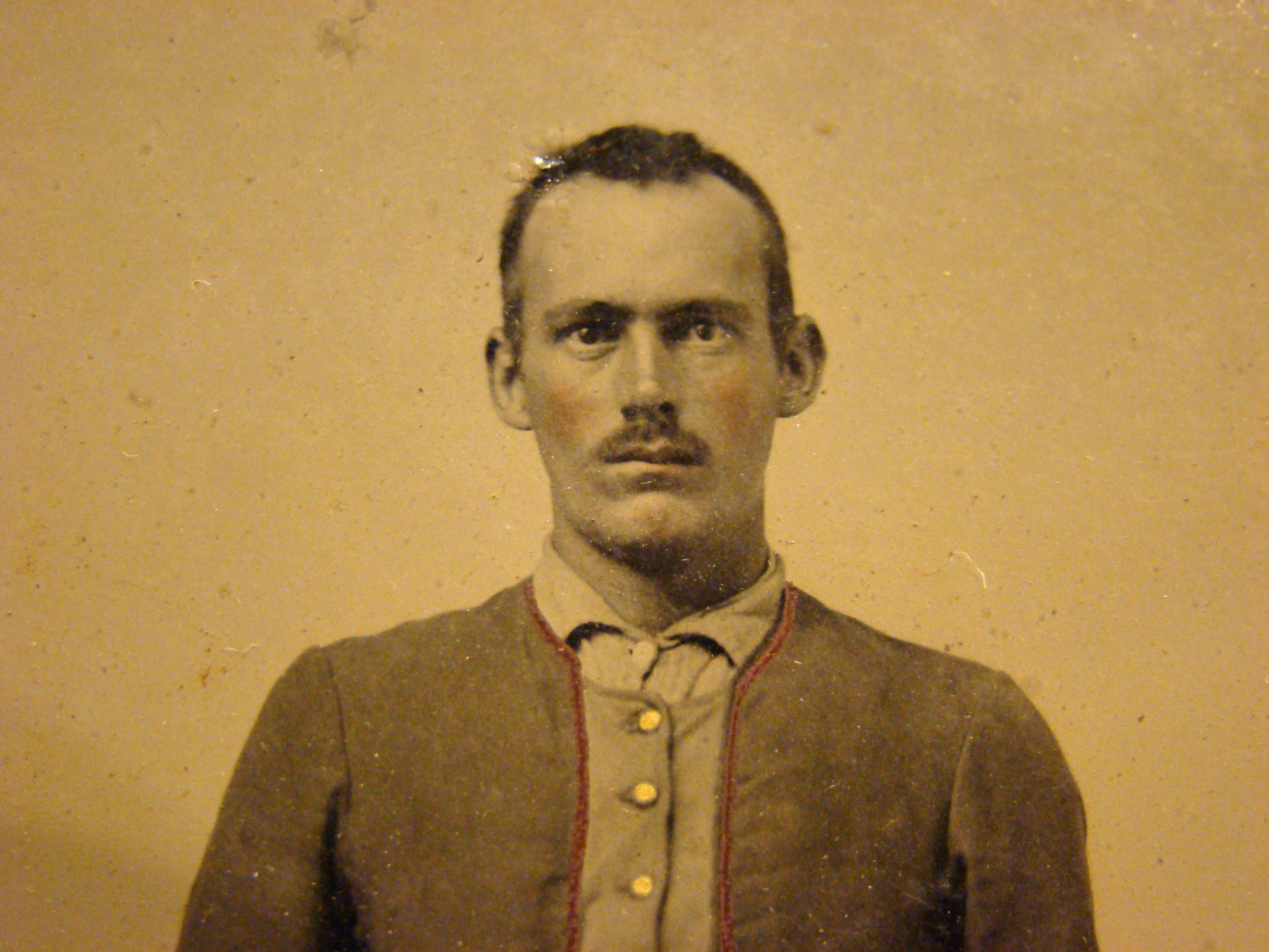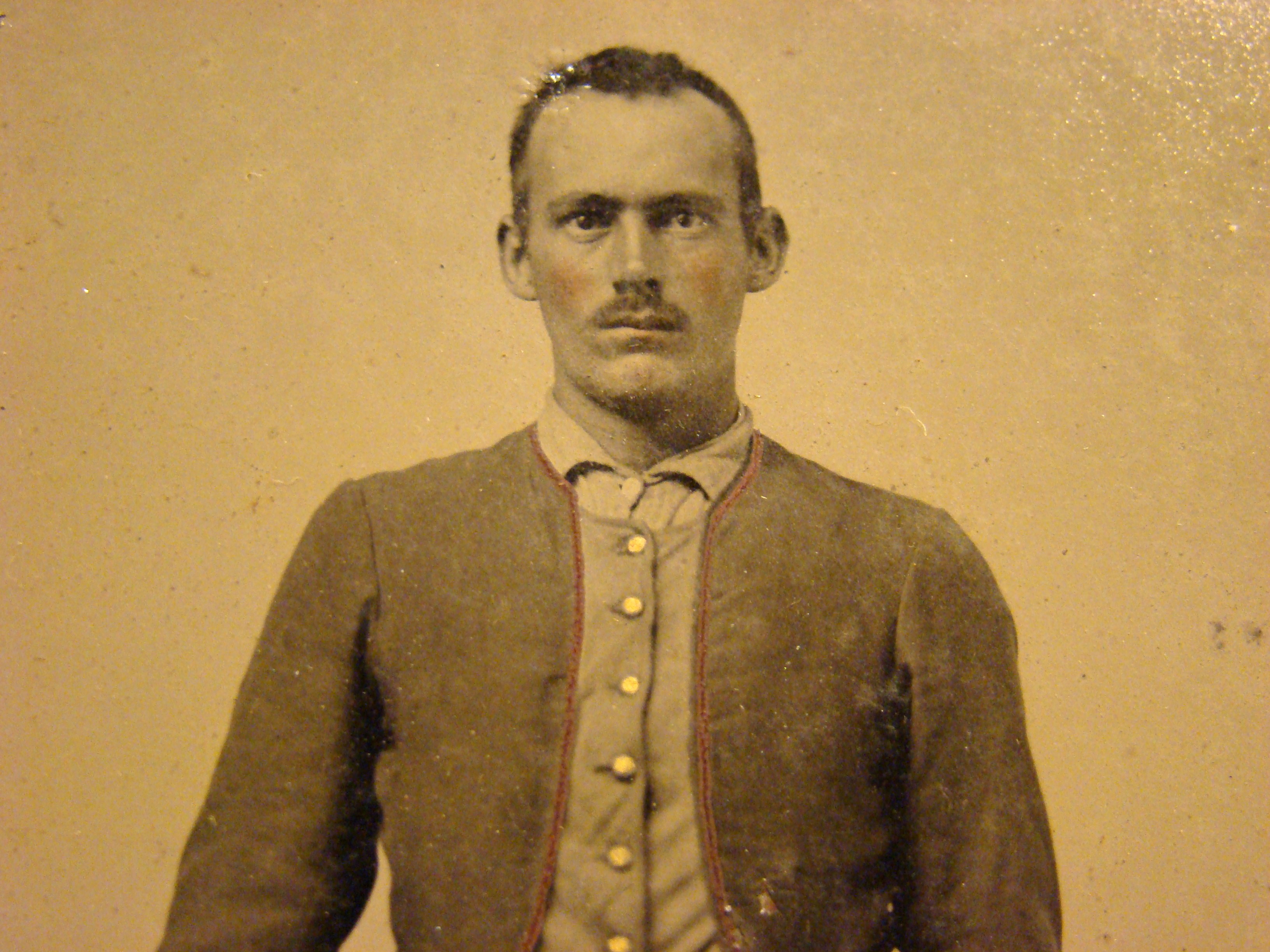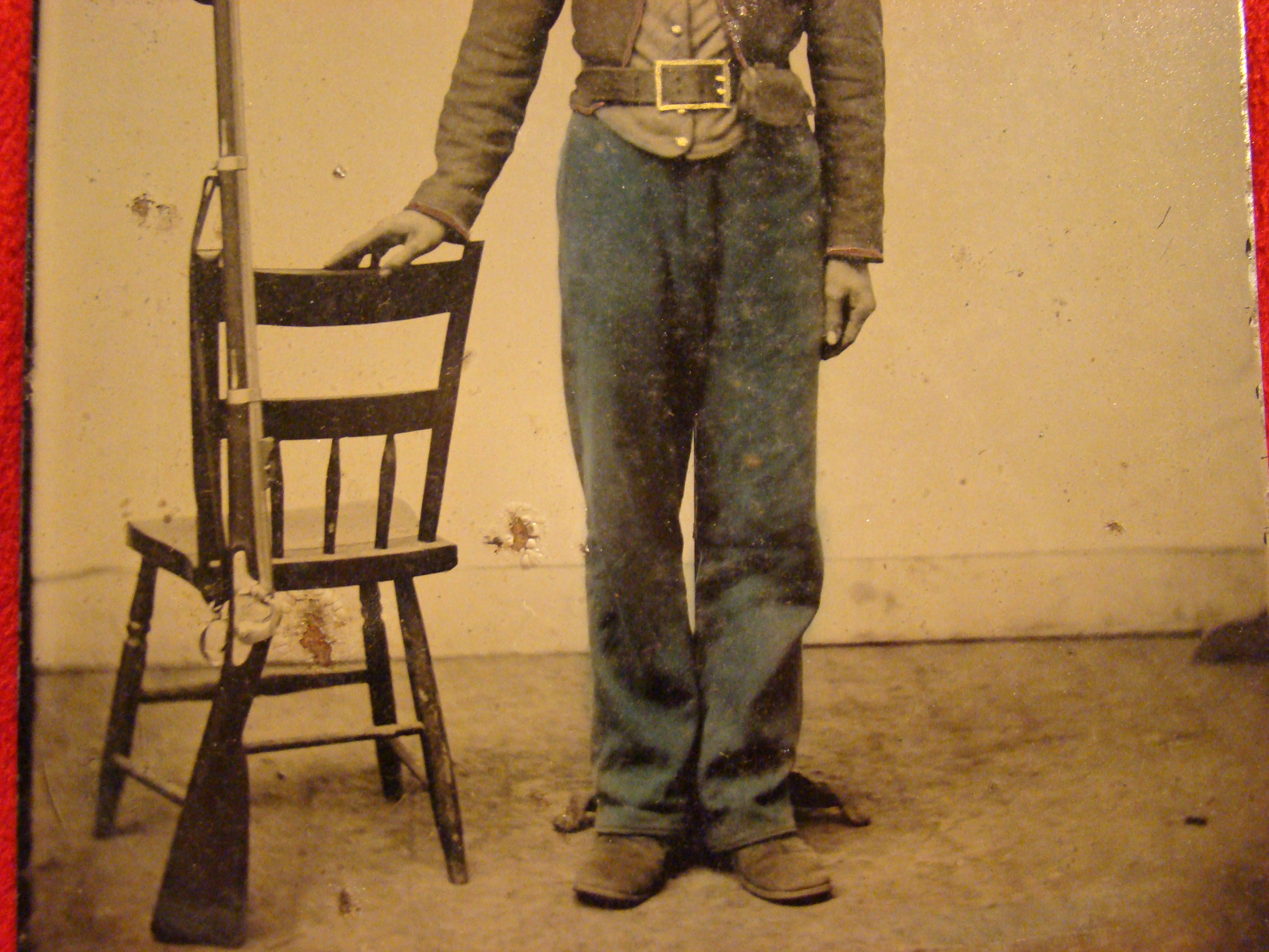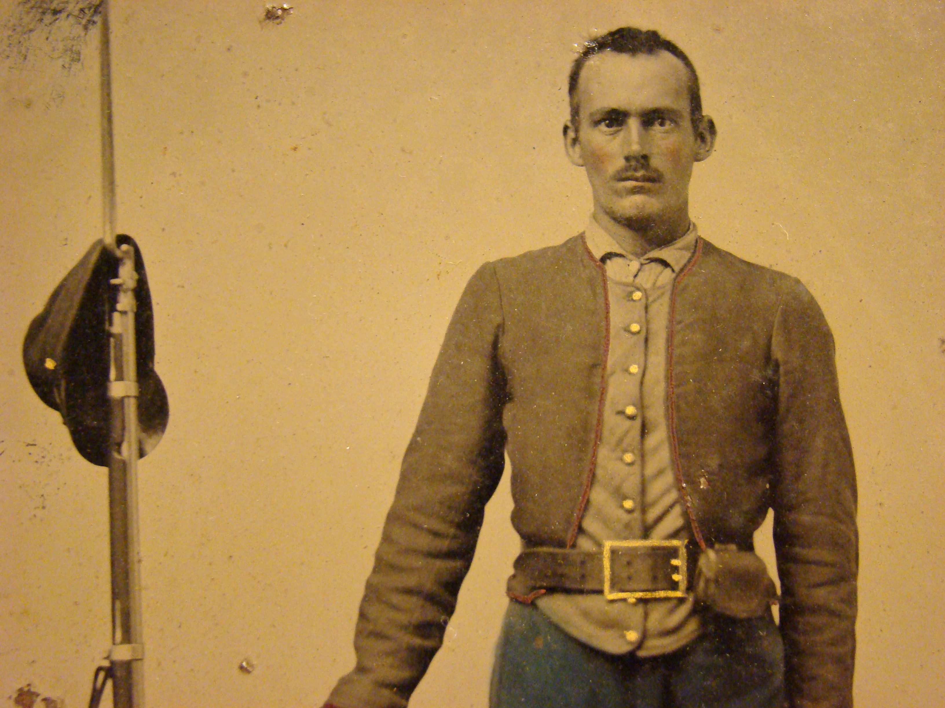 This image is published, but I cannot remember which book it is in, possibly William Turner’s “Even More Confederate Faces”. The un-identified Confederate private featured here is seated with a Bacon Revolver in his belt and a Large D-Guard Knife in his hand. The tin scabbard is also visible. The leatherette case is original but has separated at the spine. The dark stripes on the shell jacket remind me of some known images of Mississippi volunteers.