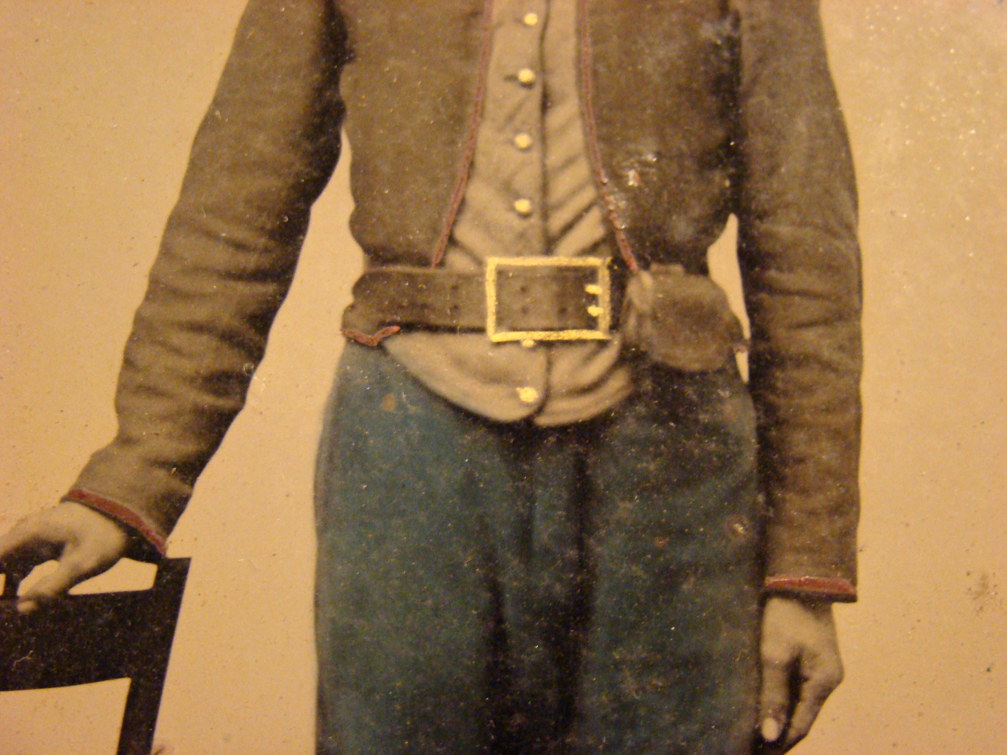 Really clear image. There is a note inside the case saying that his name was “John S. Potter”. He is decked out in very fine style with a shako hat, eppaulets, buff leather accoutrement belt and cross belt, Infantry horn breastplate and Massachusetts State seal coat buttons. Thermoplastic case is separated at the hinges. It may be worthwhile for someone to research this soldier.