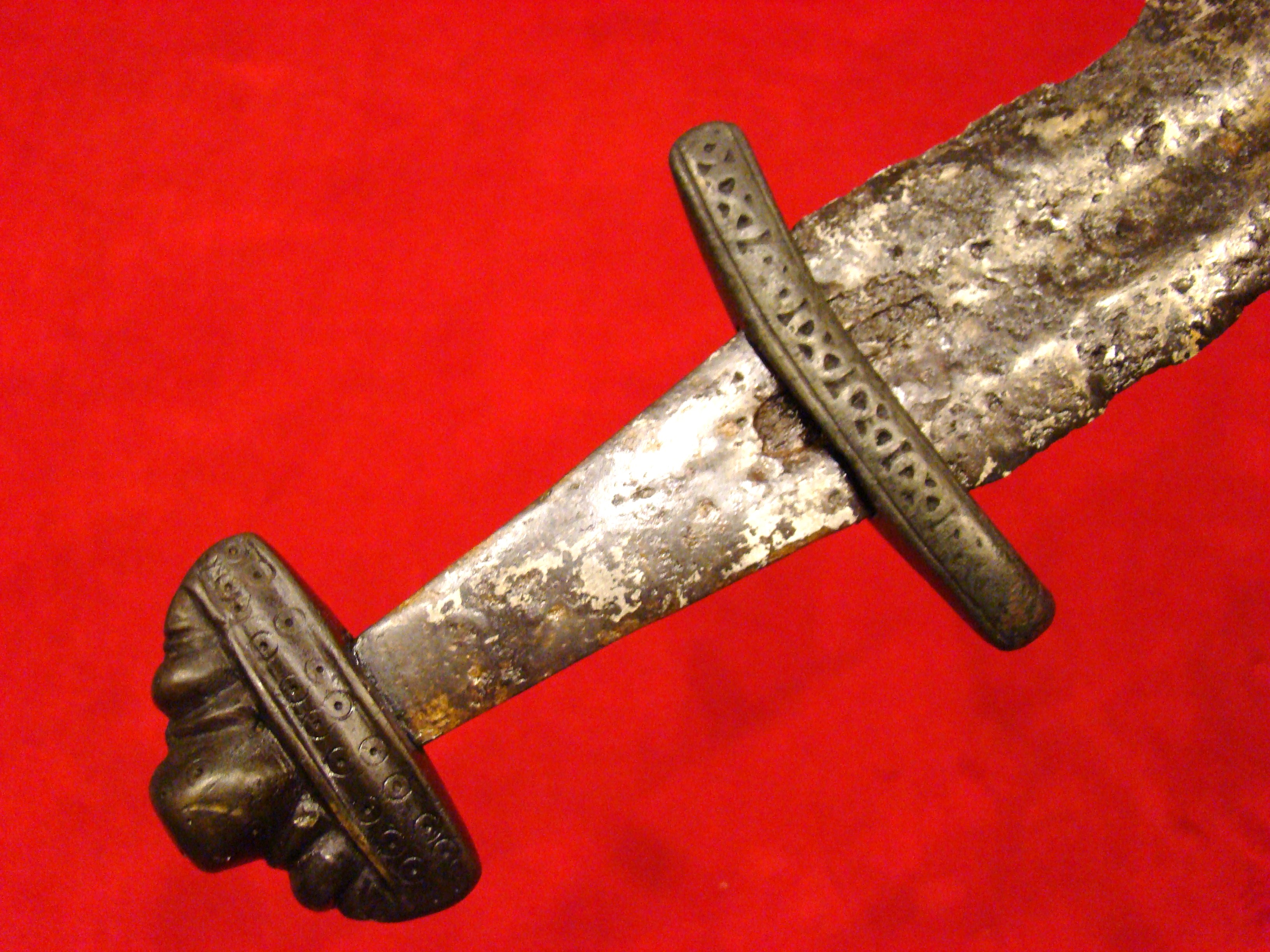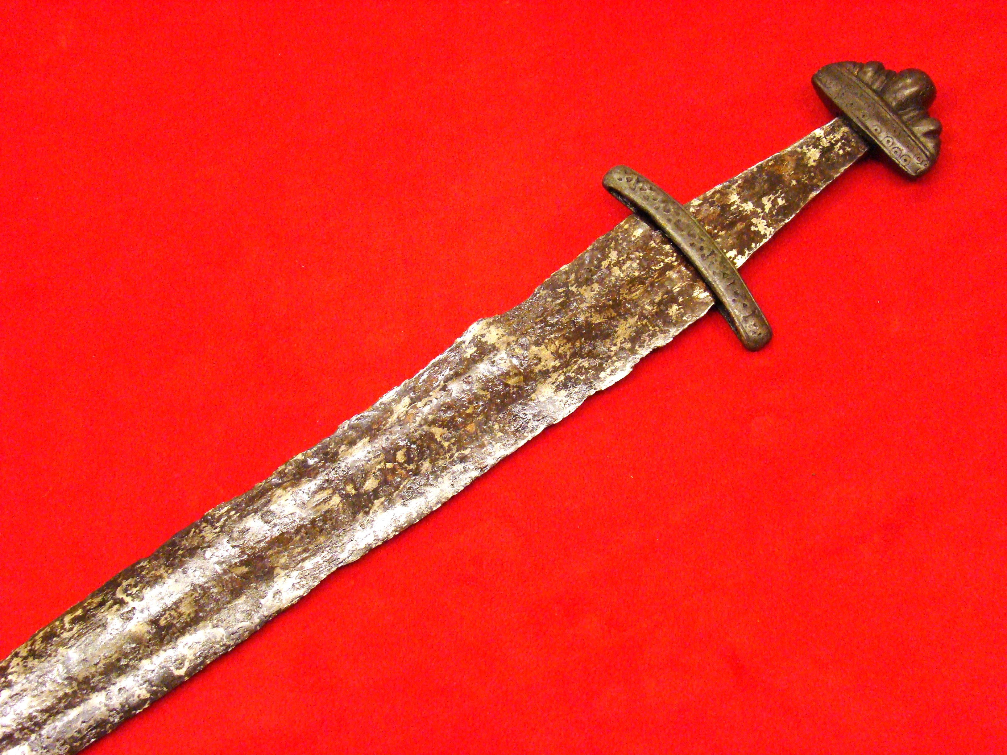 Found in Central Latvia. The Curonians were a Baltic People with close contacts with the Danish and Swedish Vikings. They evolved into the powerful European nation state of Prussia. On several occaisions they were allied with the Vikings in struggles for power in Scandinavia, and alternately raiding Southern Sweden. At the Battle of Bravellir (770), the Swedes had a resounding victory over the Danes with the help of Curonian and Kievan Rus allies. You can see the obvious resemblance of this sword to the its Viking counterparts. The Curoniams were fond of decorative bronze pommels and cross-guards. In this case, the cross-guard is original to the sword, the pommel is also original, but came from another sword. The blade was heavily corroded, and has been professionally treated. Inspite of this, the steel is solid and retains its temper. $2500.00