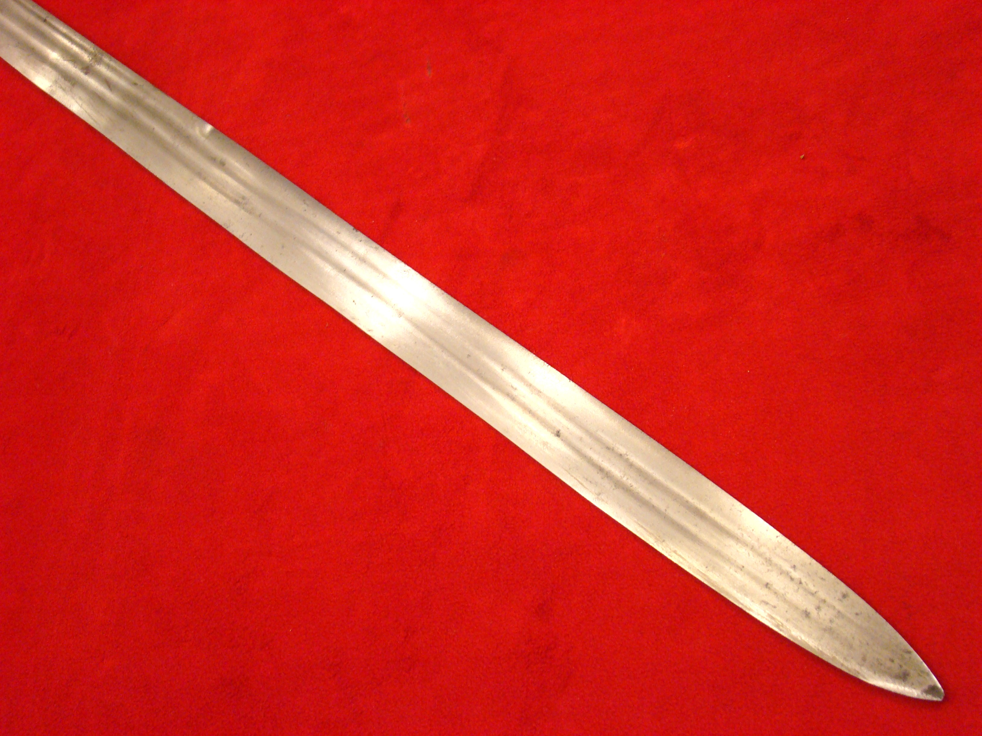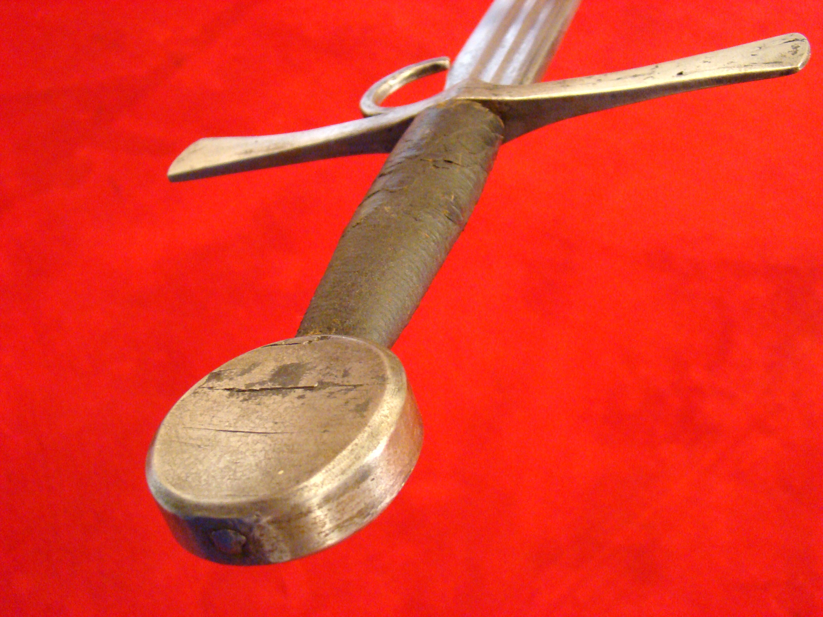 This fine sword is quite rare. It is classified as a Type XIX by English Medieval Sword expert and author Ewart Oakshott. Designed for piercing attacks as well as slashing. Note flaring terminals on cross-guard with finger ring and wheel pommel. Leather grip appears original and shows great age. Double fullered blade is mostly smooth and polished, with a few areas of surface oxidation. Overall length is 43″ with a 36.5″ blade. This impressive and elegant sword shows the evolution towards more narrow blades and rapiers. SOLD “The Baron”